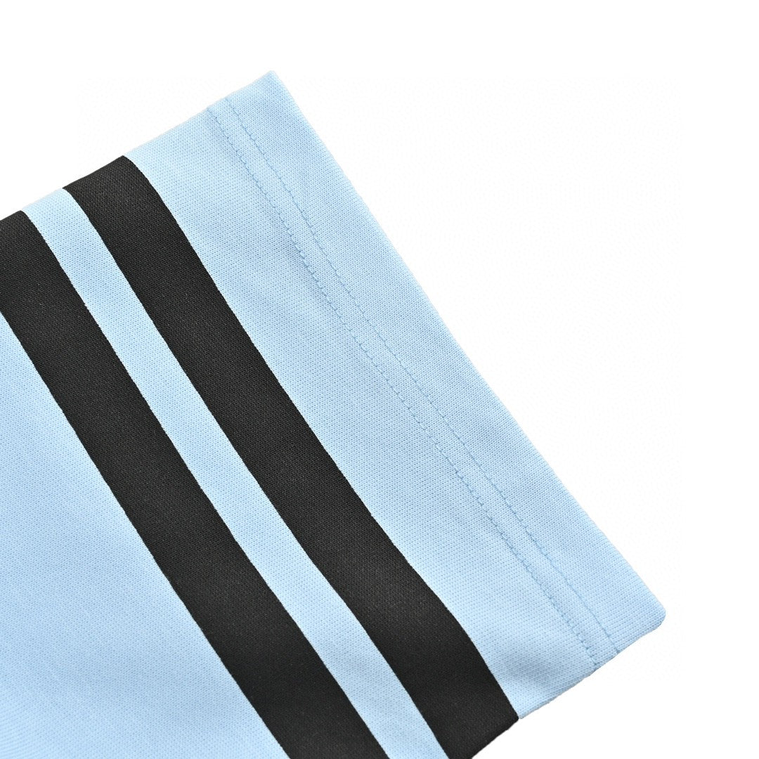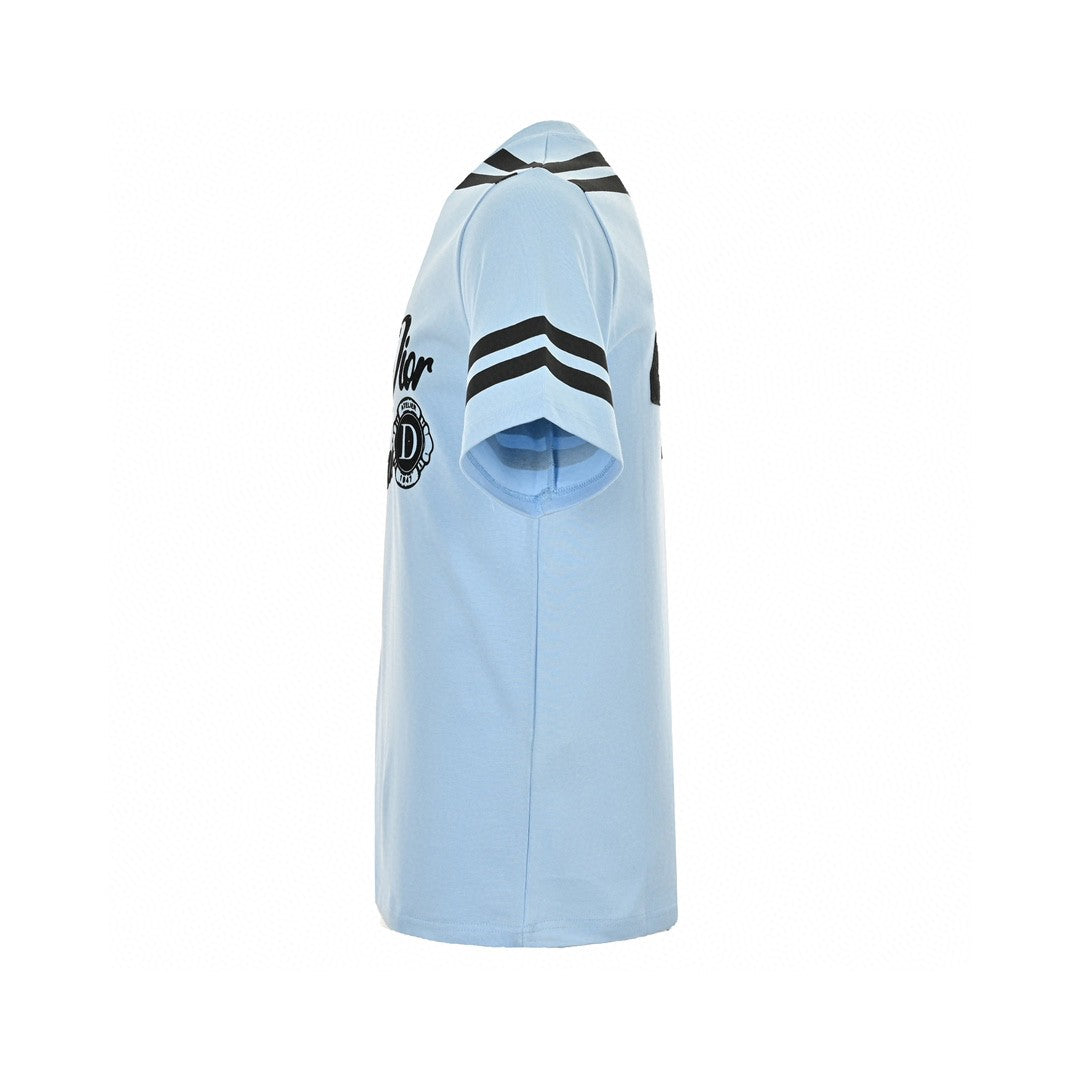 This Dior t-shirt features a bold graphic design with "Christian Dior Couture" text prominently displayed. The light blue cotton fabric is complemented by black details and stripes on the shoulders and sleeves. This stylish t-shirt combines luxury with a sporty touch, making it a standout piece for any casual outfit.