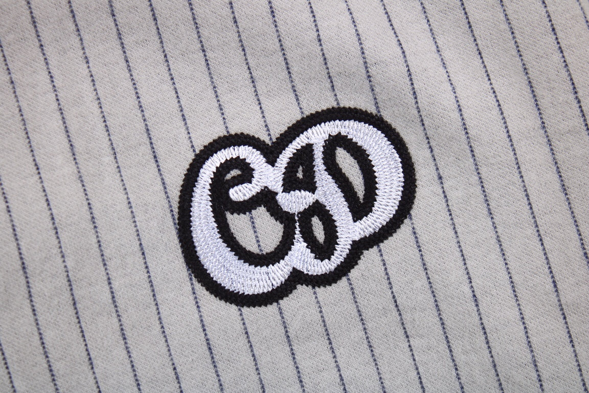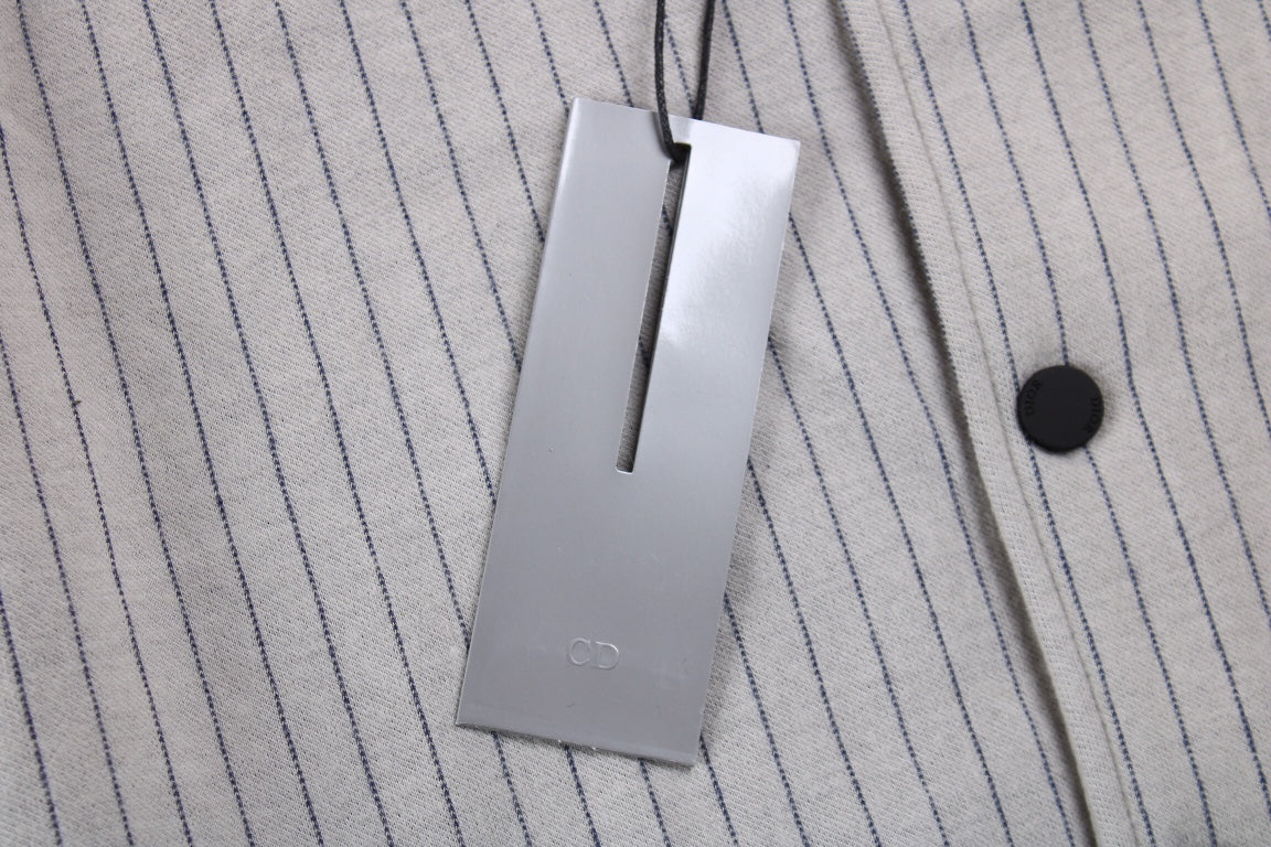 This grey Dior bomber jacket features a classic pinstripe design and a comfortable fit. The jacket has a button-up front, two side pockets, and the "CD" logo on the chest. Ribbed cuffs, hem, and collar add a touch of style, making it a perfect addition to your casual wardrobe.