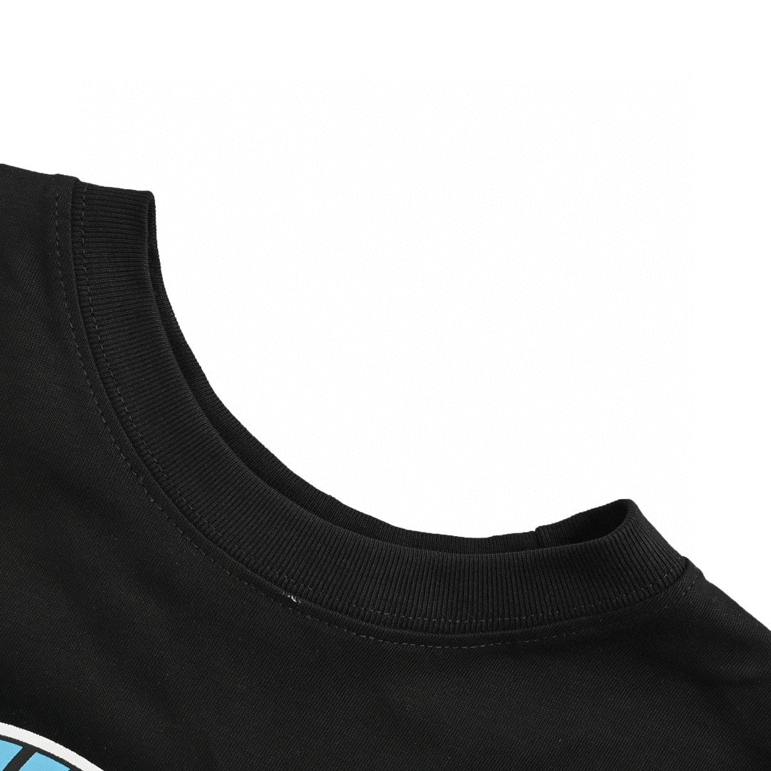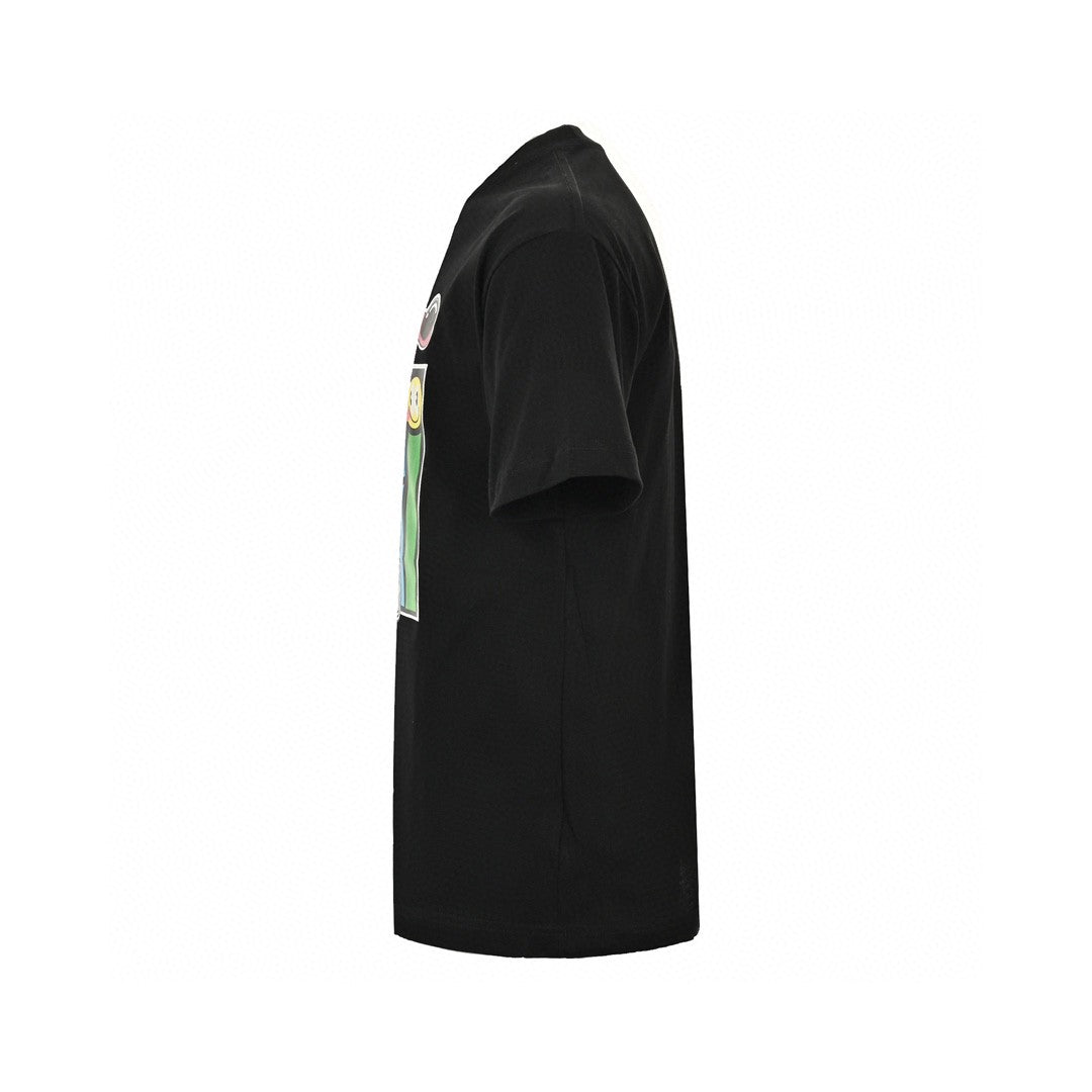 This black Gucci T-shirt features a playful and vibrant cartoon graphic design. The front showcases a multicolored, drippy Gucci logo flanked by whimsical icons including an alien, a UFO, and a smiley face. Crafted from high-quality materials, this T-shirt combines comfort with standout style. The casual fit and classic crew neckline make it a versatile addition to any wardrobe, perfect for adding a touch of fun to your everyday look.