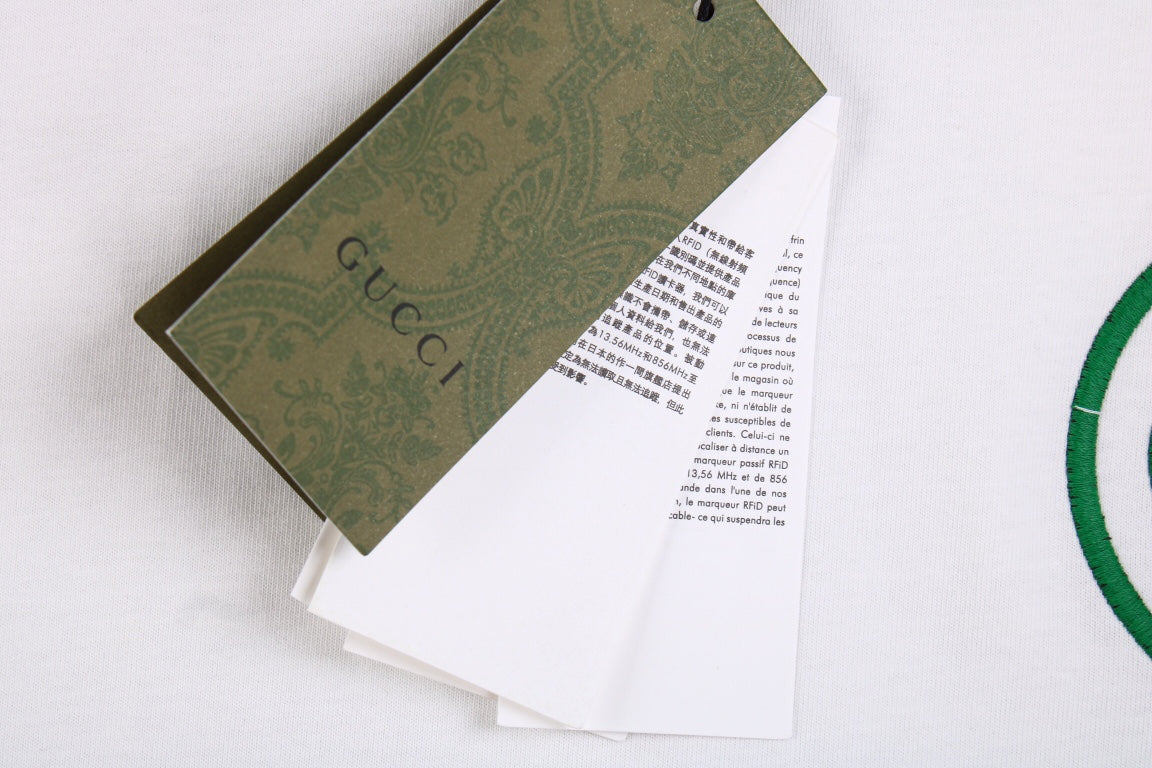 White polo shirt featuring a green embroidered Gucci logo on the chest. Green collar and sleeve accents add a stylish contrast. Made from premium cotton for a comfortable and classic fit. Perfect for a refined casual look.