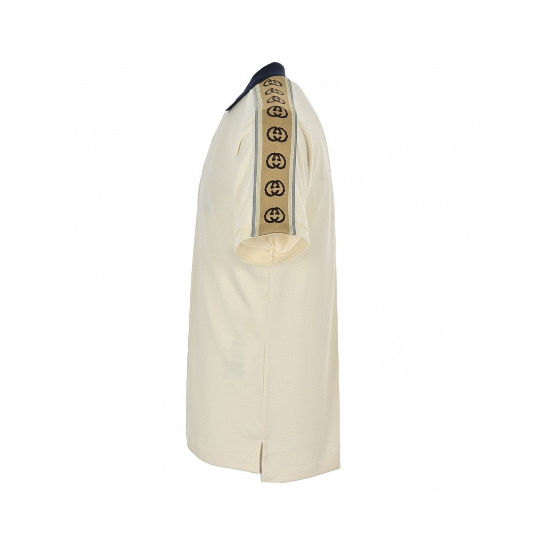 This Gucci Polo Shirt in a creamy white color features signature logo tape detailing along the shoulders and sleeves. The shirt is crafted from high-quality, comfortable fabric and includes a navy collar and a three-button placket for a classic polo look. The iconic Gucci logo tape adds a touch of luxury and distinctive style, making it a perfect addition to any fashion-forward wardrobe. Ideal for casual wear with a touch of sophistication.