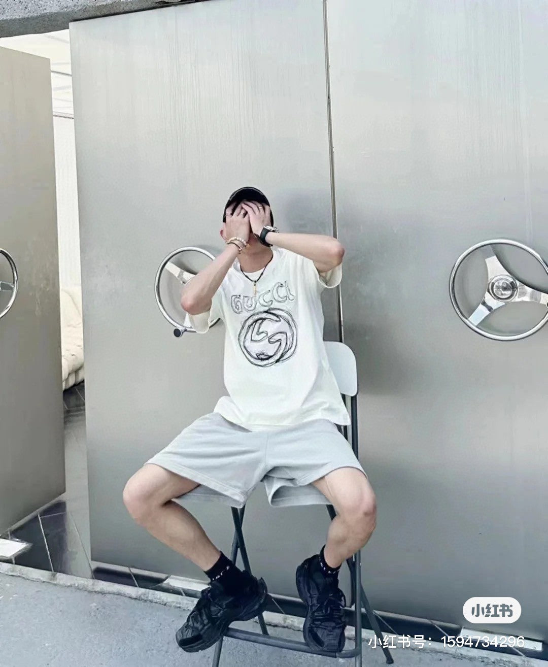 This Gucci t-shirt features a distinctive design with the iconic Gucci logo in a scribble style. The white fabric provides a clean backdrop that highlights the playful and artistic logo. Perfect for adding a creative touch to your casual wardrobe, this t-shirt is ideal for those who appreciate unique and eye-catching designs.