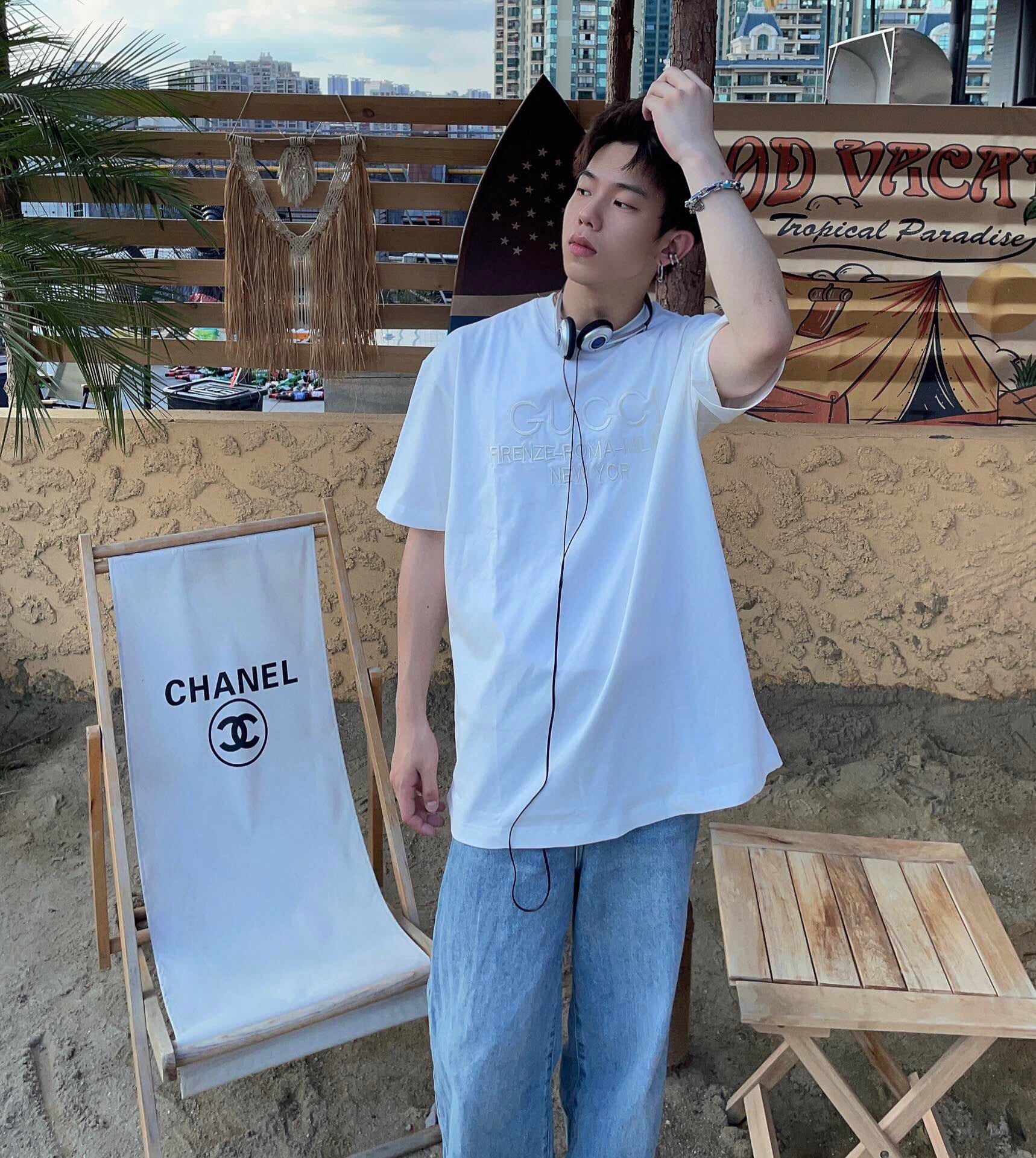 White t-shirt featuring subtle embroidered text with the cities "FIRENZE-ROMA-MILANO-NEW YORK" under the Gucci logo. Crafted from premium cotton for a comfortable fit. Ideal for adding a touch of sophistication to casual wear.