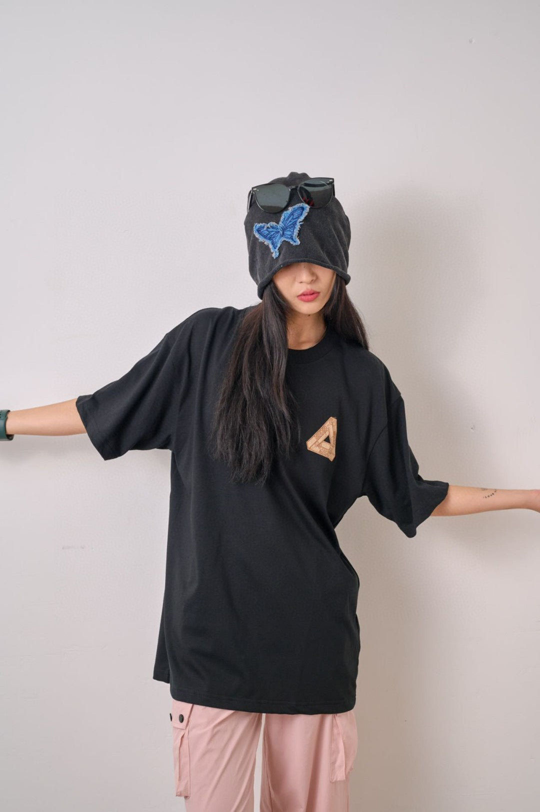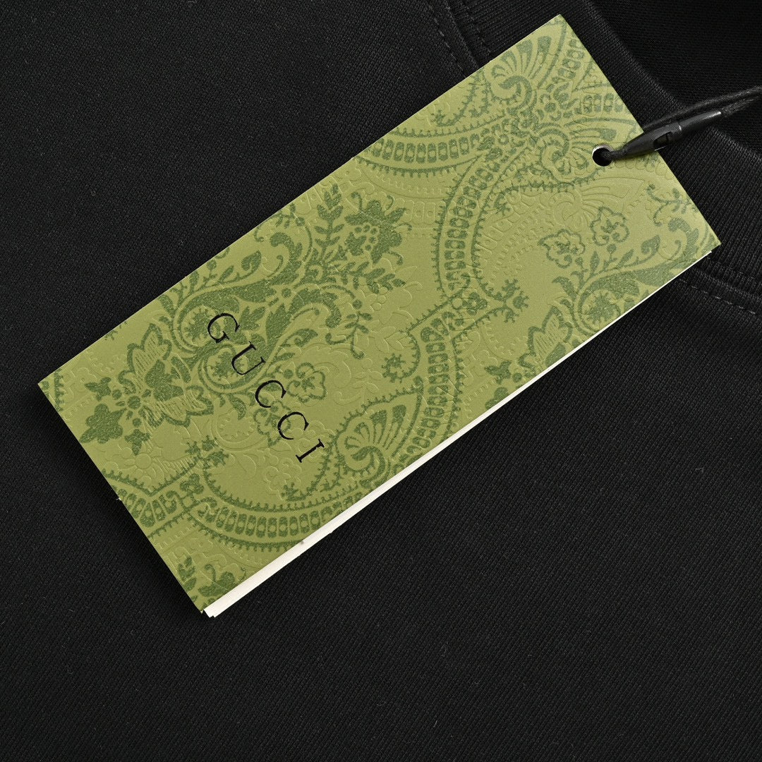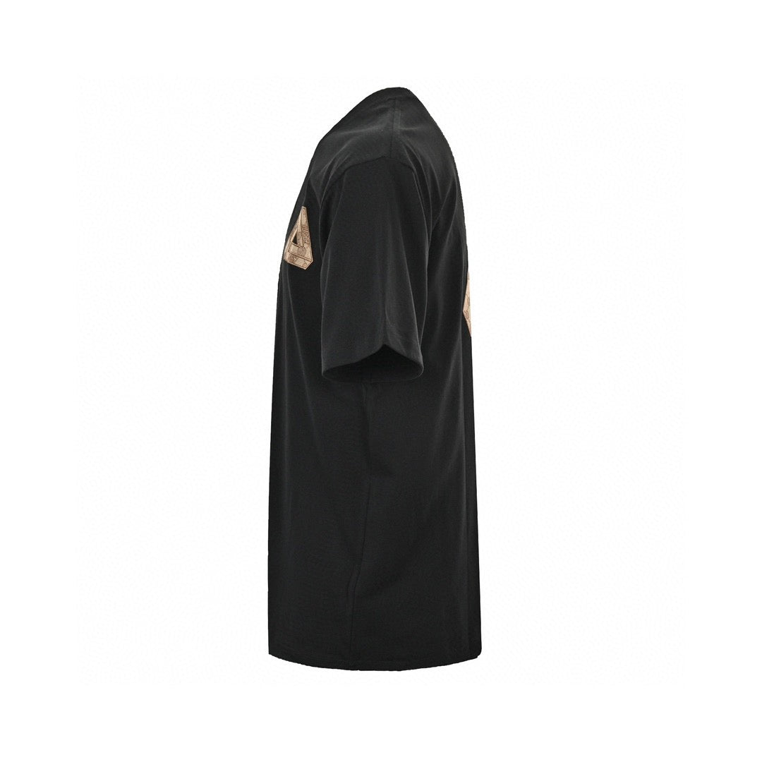 This Gucci t-shirt features a subtle triangle logo on the chest. The shirt is primarily black, offering a relaxed fit with short sleeves and a high neck. Perfect for adding a touch of understated luxury to your casual wardrobe while staying comfortable.